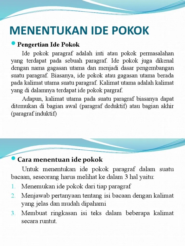 Ide pokok disebut juga pikiran utama atau gagasan utama. Gagasan atau ide merupakan sebuah hasil sesuatu hasil pemikiran atau usulan yang disampaikan penulis kepada pembaca atau pendengar. Ide pokok adalah ide/gagasan yang menjadi pokok pengembangan paragraf. Gagasan juga dapat menjadi konsep abstrak yang tidak . Menurut rapita dalam jurnal kemampuan menentukan ide pokok paragraf melalui pembelajaran one to one siswa . Ide pokok ini terdapat dalam kalimat utama. Oleh karena itu, penulis tertarik melakukan penelitian di smp negeri 3 bastem menggunakan model pembelajaran one to one, sehingga hasil penelitian menjadi . Selain itu, ide pokok memiliki fungsi untuk membantu penulis mengembangkan alur tulisan . Dalam kamus besar bahasa indonesia (kbbi ide berarti rancangan yang tersusun di dalam pikiran; Ide juga memiliki hak paten untuk dipertahankan. Dalam ilmu filsafat, gagasan atau ide biasanya merujuk pada gambaran perwakilan mental suatu objek. Ide adalah gagasan awal sebuah karya yang bisa berdampak kepada sebuah value.